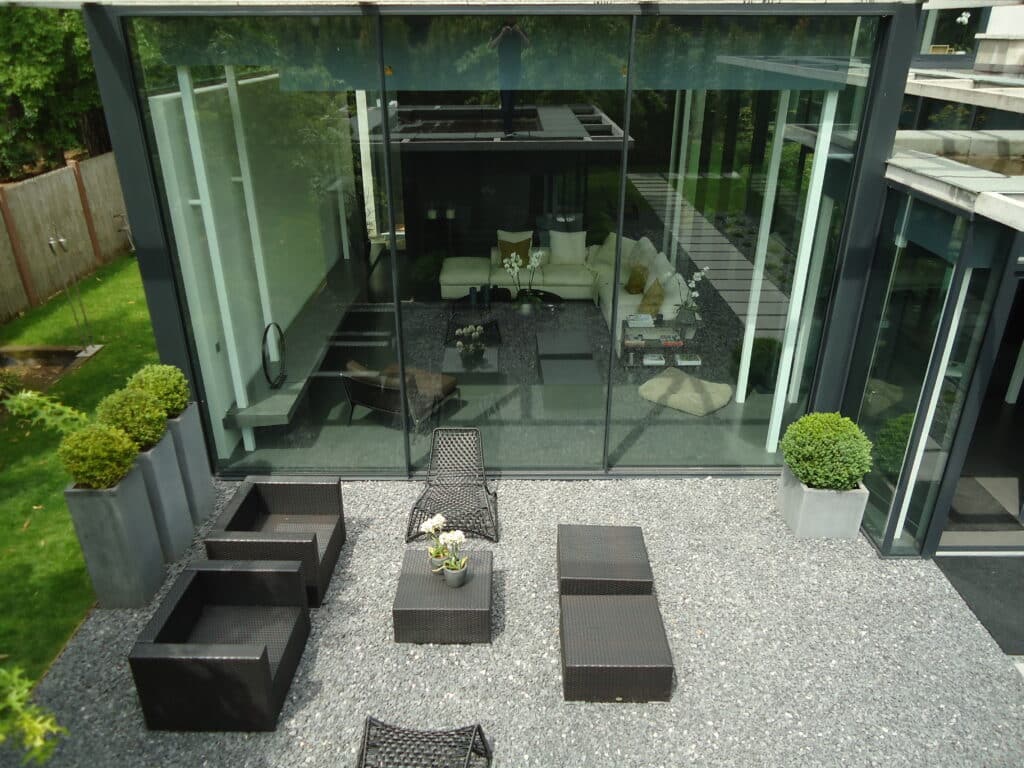 - Baies vitrées panoramiques : des châssis minimalistes pour maximiser la lumière naturelle et dégager la vue sur Meudon.